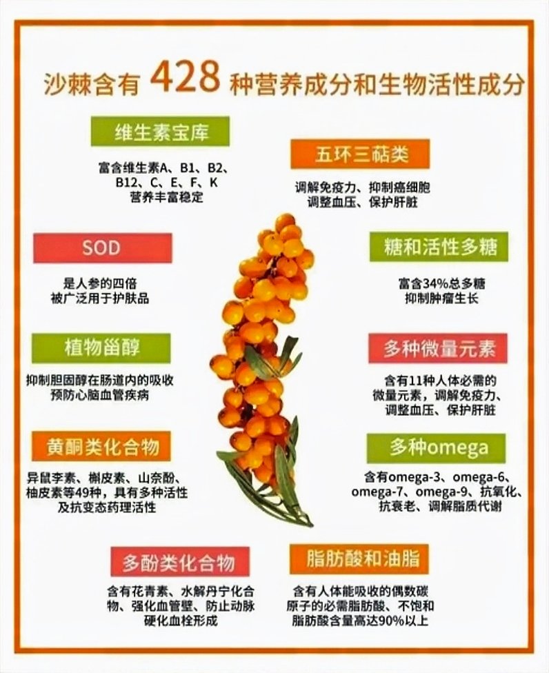 时光流转,现代科学揭开了这古老智慧的神秘面纱。科学家们惊讶地发现,这毫不起眼的沙棘果,竟是自然界罕见的“营养宝库”:它所蕴含的维生素C,远超我们熟知的猕猴桃和柑橘,是当之无愧的“VC之王”;富含的沙棘黄酮、多种维生素(A、E、K等)、矿物质、不饱和脂肪酸(如Omega-7)以及超氧化物歧化酶(SOD),构筑起强大的抗氧化、增强免疫、修复黏膜、滋养肌肤的“生命防线”。它那独特的酸冽口感,正是大自然浓缩的生命力在歌唱。