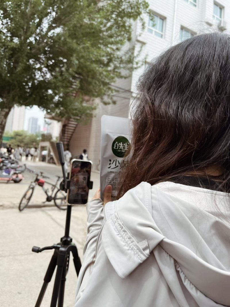 几位同学举着产品,配合直播展示,向观众详细介绍产品信息,周围同学参与互动,现场热闹,并引路过同学关注。