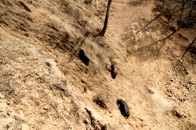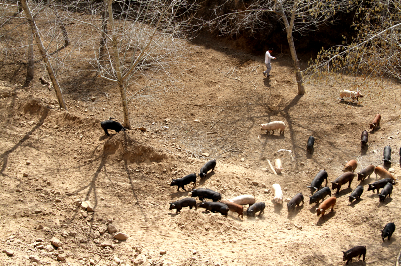 本县小王庄村有个年轻人买回野种猪,将繁殖的猪群放在村外一条沟里,猪啥建在高处。每次喂养完毕将猪赶下沟里,猪饿了渴了主动爬上陡坡,吃饱喝足又赶下山坡,每天起码反复三次。猪肉韧性好,口感好,味道好,营养高,售价高,猪肉就地消化。