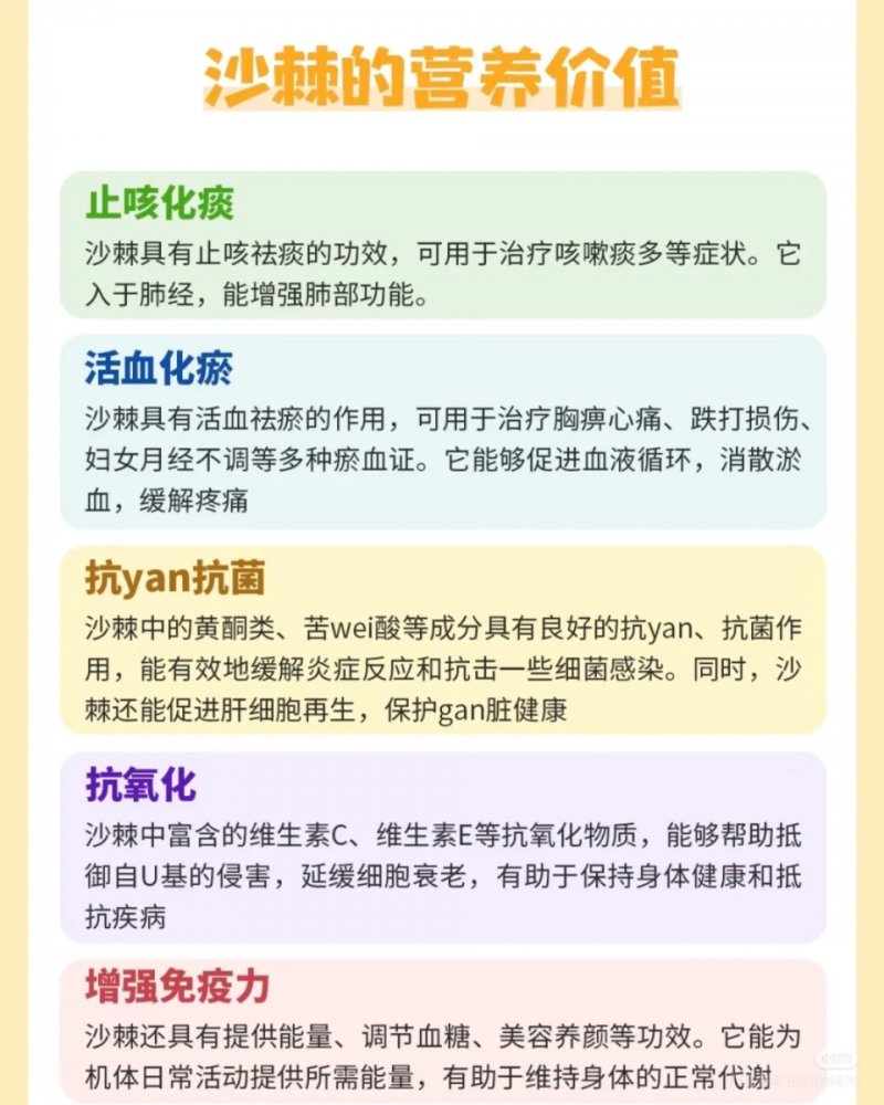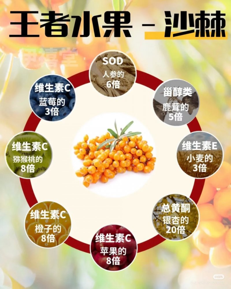后来我专门去查了资料,才知道这小小的沙棘果居然是个隐藏的“营养大佬”!它的维生素C含量比柠檬高几十倍,堪称“天然维C炸弹”,能帮我们这些经常熬夜、饮食不规律的大学生增强免疫力;还有超多抗氧化成分,妥妥的“抗氧小能手”,拯救被熬夜摧残的肌肤!
