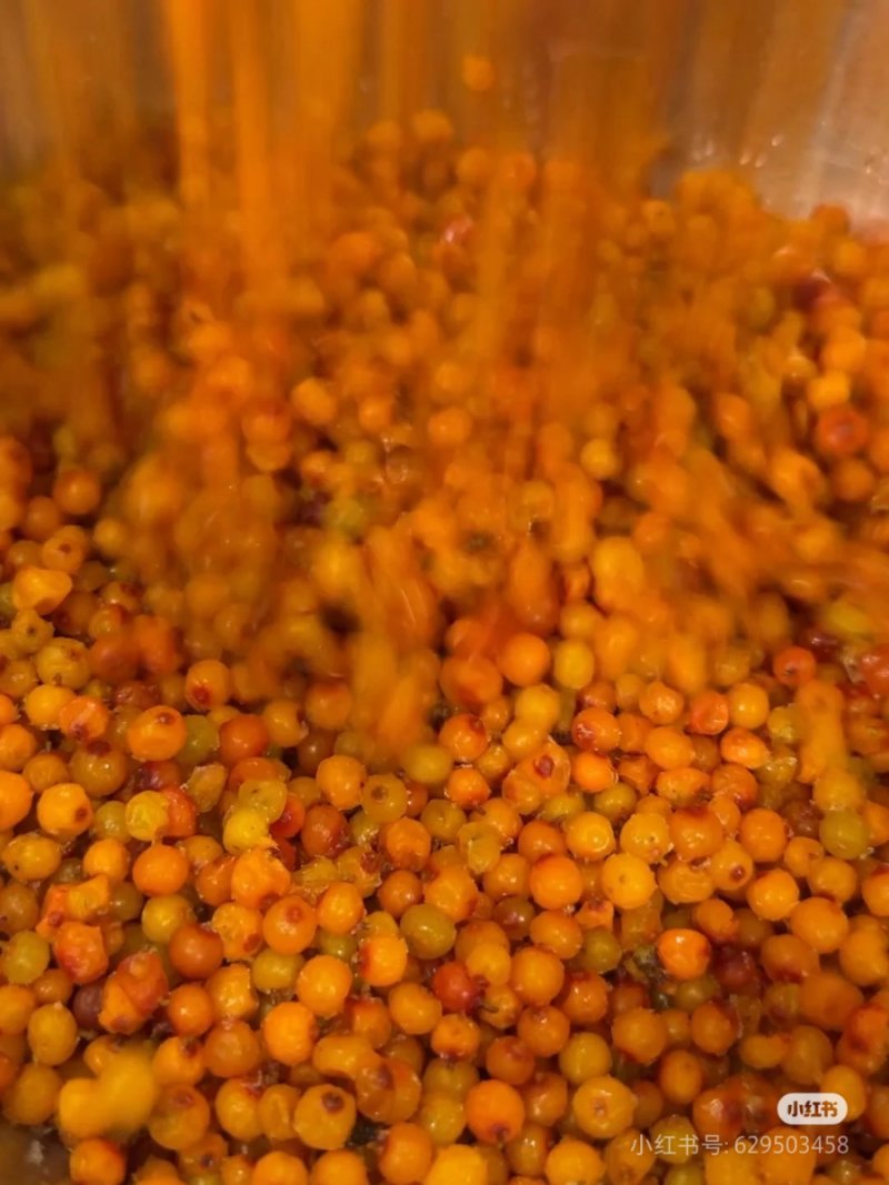 带回家的沙棘枝平铺进冰箱,零下18℃冰封12小时。冷冻后的果子像乖巧的精灵,轻轻一抖就脱落枝头13。洗净时浮起的枯叶与瘪果被仔细筛去,只留饱满金果在水中翻滚,宛如星河坠入盆中23。
