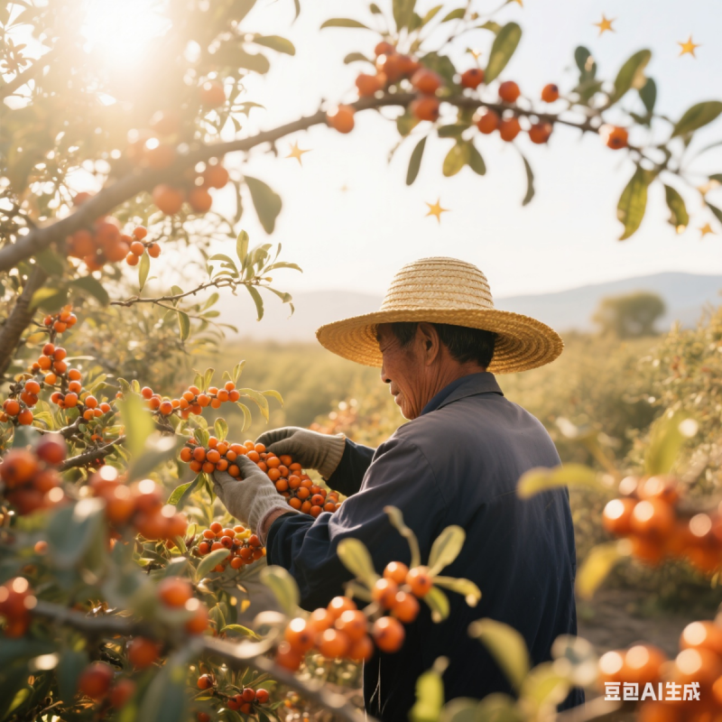 沙棘刺扎破手指,老赵却笑出满脸褶子:「选果要挑阳面晒足的,酸中带甜才够味儿!」