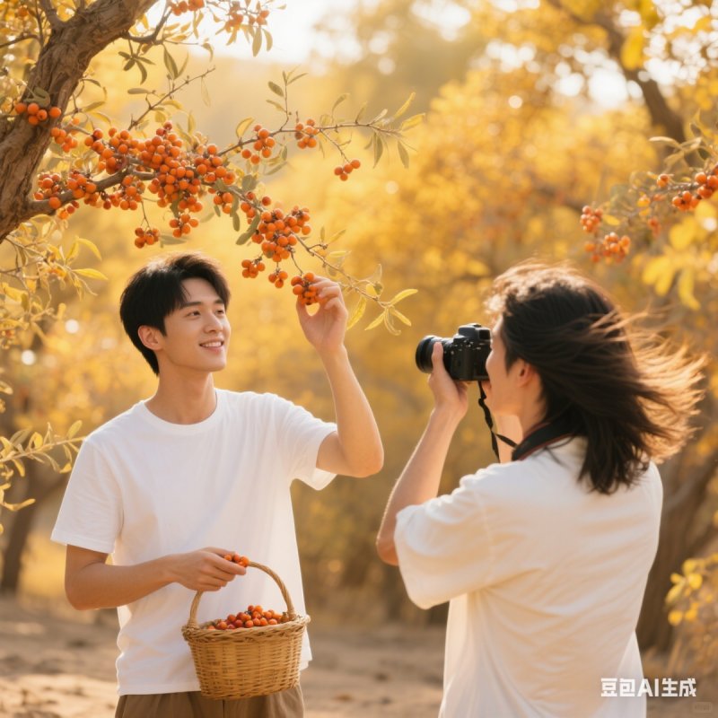 就在她专注地调整相机参数时,眼前突然出现了一个身影。那是一位穿着简单白色半袖男子,他正站在一株沙棘树下,手中拿着一个竹篮,专注地采摘着沙棘果。阳光透过树叶的缝隙洒在他身上,勾勒出他俊朗的轮廓,仿佛他是这片沙棘林中走出的精灵。