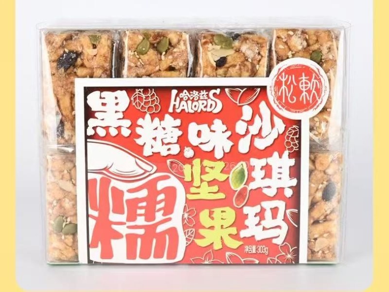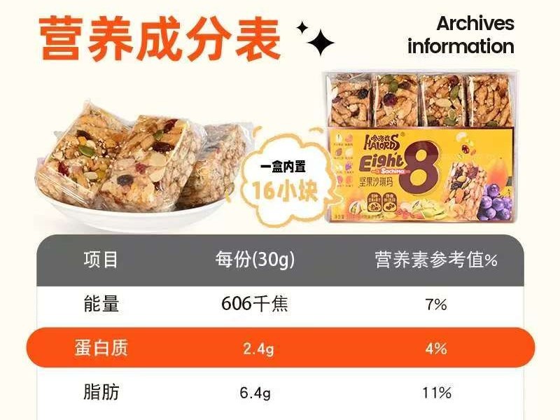 产品描述:黑糖味坚果沙琪玛,口感软糯香甜,精选优质原料,健康配方,不添加蔗糖、色素、防腐剂,不含反式脂肪酸,专利低糖酥脆,富含坚果与果干,营养丰富,适合家人风享、工作小憩或居家充饥,是健康美味的补充选择。